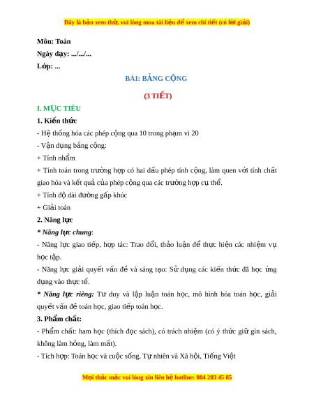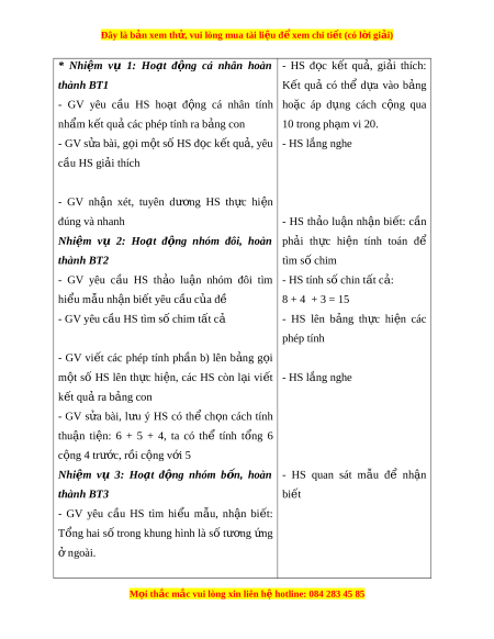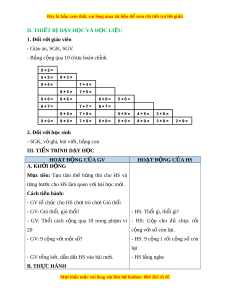 Đây là bản xem th , vu ử i lòng mua tài li u ệ đ xe ể m chi ti t (c ế ó l i ờ gi i ả ) II. THIẾT B D Ị ẠY H C Ọ VÀ H C Ọ LI U Ệ 1. Đ i ố v i ớ giáo viên - Giáo án, SGK, SGV. - B ng ả c ng qua 10 ch ộ a ư hoàn ch nh. ỉ 2. Đ i ố v i ớ h c s ọ inh - SGK, v ghi ở , bút vi t ế , b ng con ả III. TI N Ế TRÌNH D Y Ạ H C Ọ HOẠT Đ N Ộ G C A Ủ GV HOẠT Đ N Ộ G C A Ủ HS A. KH I Ở Đ N Ộ G Mục tiêu: T o ạ tâm thế h ng ứ thú cho HS và t ng b ừ ư c ớ cho HS làm quen v i ớ bài h c ọ m i ớ . Cách ti n hà ế nh: - GV tổ ch c ứ cho HS ch i ơ trò ch i ơ Gió th i ổ - GV: Gió th i ổ , gió th i ổ ! - HS: Th i ổ gì, th i ổ gì? - GV: Th i ổ cách c ng ộ qua 10 trong ph m ạ vi - HS: G p ộ cho đủ ch c ụ r i ồ 20 c ng ộ v i ớ số còn l i ạ . - GV: 9 c ng v ộ i ớ m t ộ số? - HS: 9 c ng ộ 1 r i ồ c ng ộ s ố còn l i ạ - GV tổng k t ế , d n d ẫ t ắ HS vào bài m i ớ . - HS l ng nghe ắ B. TH C Ự HÀNH M i