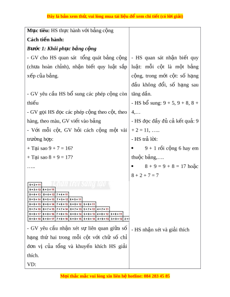 Đây là bản xem th , vu ử i lòng mua tài li u ệ đ xe ể m chi ti t (c ế ó l i ờ gi i ả ) - HS l ng nghe G ắ V - GV gi i ả thích t i ạ sao các t ng ổ trong các ô cùng màu l i ạ b ng nhau. ằ Ví d : ụ 9 + 2 = 8 + 3 GV gi i ả thích trên m t ộ tình hu ng c ố t ụ h : ể