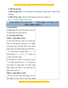 ớ giáo viên: GV nên chu n ẩ bị hình phóng to b ng ả nhân 2 ho c ặ chi u ế lên b ng ả b. Đ i ố v i ớ h c s ọ inh: V ghi ở , b đ ộ ồ dùng h c t ọ p ậ toán 2, b ng con ả III. CÁC HO T Ạ Đ N Ộ G D Y Ậ H C Ọ HOẠT Đ N Ộ G C A Ủ GIÁO VIÊN HOẠT Đ N Ộ G C A Ủ H C Ọ SINH TI T Ế 1: BẢNG NHÂN 2 I. KHÁM PHÁ a. M c ụ tiêu: T o ạ tâm thế h ng ứ thú cho HS và t ng b ừ ư c ớ làm quen bài h c. ọ b. Cách th c t ứ i n hành: ế Bư c