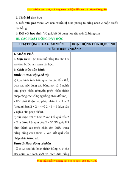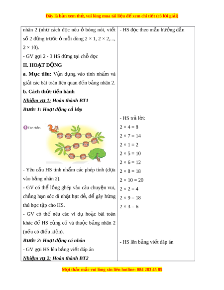 Đây là bản xem th , vu ử i lòng mua tài li u ệ đ xe ể m chi ti t (c ế ó l i ờ gi i ả ) nhân 2 (như cách đ c ọ nêu ở bóng nói, vi t ế - HS đ c t ọ heo m u h ẫ ư ng d ớ n ẫ số 2 đ ng ứ trư c ớ ở m i ỗ dòng 2 × 1, 2 × 2,..., 2 × 10). - GV g i ọ 2 - 3 HS đ ng t ứ i ạ ch đ ỗ c ọ II. HOẠT Đ N Ộ G a. M c ụ tiêu: V n ậ d ng ụ vào tính nh m ẩ và gi i