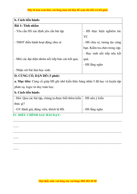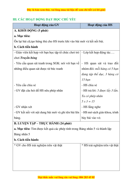 a. Mục tiêu: Tìm được kết quả các phép tính trong Bảng nhân 5 và thành lập Bảng nhân 5 b. Cách tiến hành: