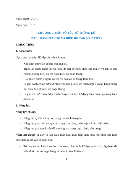 BÀI 1. BẢNG TẦN SỐ VÀ BIỂU ĐỒ TẦN SỐ (2 TIẾT) I. MỤC TIÊU: