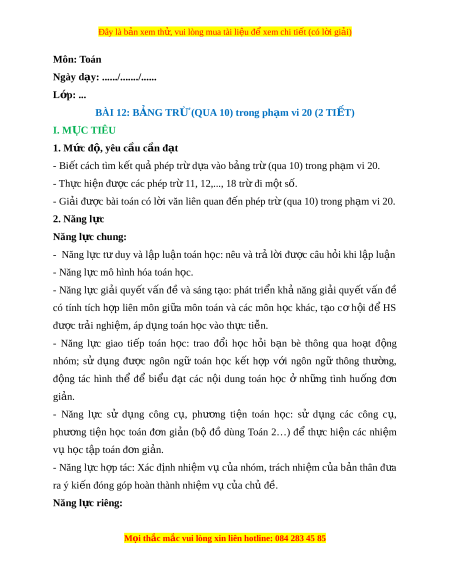 ờ văn liên quan đ n phép t ế rừ (qua 10) trong ph m ạ vi 20. 2. Năng l c ự Năng l c chung ự : - Năng l c t ự duy và ư l p l ậ u n t ậ oán h c: ọ nêu và tr l ả i ờ đư c ợ câu h i ỏ khi l p ậ lu n ậ - Năng l c m ự ô hình hóa toán h c. ọ - Năng l c ự gi i ả quy t ế v n ấ đ và ề sáng t o: ạ phát tri n ể kh ả năng gi i ả quy t ế v n ấ đề có tính tích h p ợ liên môn gi a