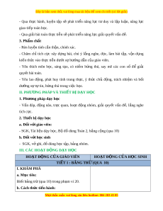 ứ thú, say mê các con số để gi i ả quy t ế bài toán. - Yêu lao đ ng, ộ phát huy tính trung th c, ự ý th c ứ chủ đ ng, ộ trách nhi m ệ và b i ồ dư ng ỡ s t ự t ự in, h ng t ứ hú trong vi c h ệ c. ọ II. PHƯ N Ơ G PHÁP VÀ THI T Ế B D Ị Y Ạ H C Ọ 1. Phư ng ơ pháp d y h ạ c ọ - Vấn đáp, đ ng ộ não, tr c ự quan, ho t ạ đ ng ộ nhóm, gi i ả quy t ế v n ấ đ , ề l ng ắ nghe tích c c. ự 2. Thi t ế b d ị y h ạ c ọ a. Đ i ố v i ớ giáo viên: - SGK, Tài li u d ệ y h ạ c, ọ B đ ộ dùng ồ Toán 2, b ng ả c ng ( ộ qua 10) b. Đ i ố v i ớ h c s ọ inh - SGK, v ghi ở , đ dùng h ồ c t ọ p, ậ b ng nhóm ả . III. CÁC HO T Ạ Đ N Ộ G D Y Ạ H C Ọ HOẠT Đ N Ộ G C A Ủ GIÁO VIÊN HOẠT Đ N Ộ G C A Ủ H C Ọ SINH