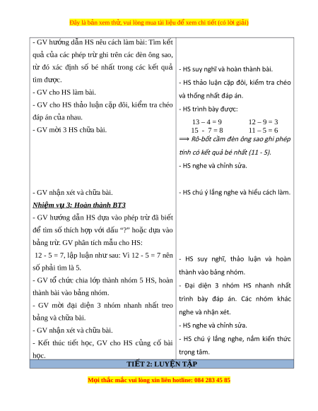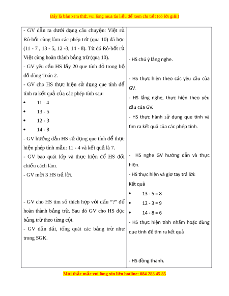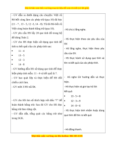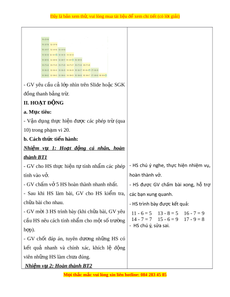 ọ thắc mắc vui lòng xin liên hotline: 084 283 45 85 Đây là bản xem th , vui ử lòng mua tài li u ệ đ xe ể m chi ti t ế (có l i ờ gi i ả ) - GV yêu c u ầ cả l p ớ nhìn trên Slide ho c ặ SGK đồng thanh b ng t ả r . ừ II. HOẠT Đ N Ộ G a. Mục tiêu: - V n ậ d ng ụ th c ự hi n ệ đư c ợ các phép trừ (qua 10) trong ph m ạ vi 20. b. Cách th c t ứ i n hành: ế Nhi m ệ vụ 1: Ho t ạ đ ng ộ