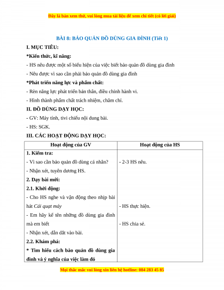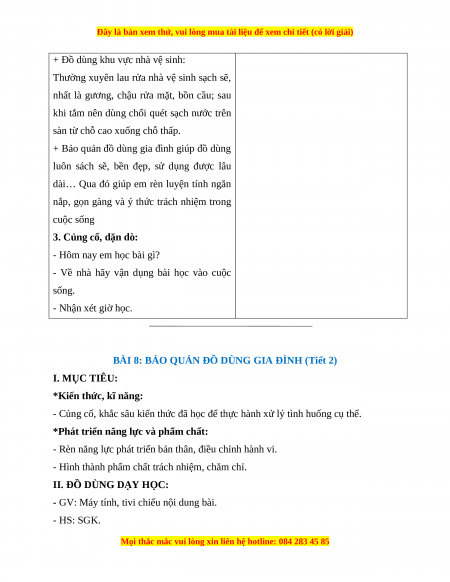 BÀI 8: BẢO QUẢN ĐỒ DÙNG GIA ĐÌNH (Tiết 1) I. MỤC TIÊU: