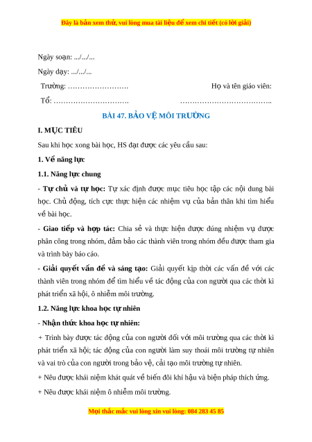 BÀI 47. BẢO VỆ MÔI TRƯ N Ờ G I. M C Ụ TIÊU Sau khi h c ọ xong bài h c, H ọ S đ t ạ được các yêu c u s ầ au: 1. V năng l ề c ự 1.1. Năng l c chung ự