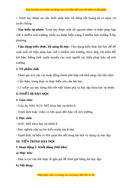 ặ video có liên quan đ n b ế o ả v m ệ ôi trư ng. ờ 2. H c ọ sinh: - SGK, SBT khoa h c ọ t nhi ự ên 8. - Đ c nghi ọ ên c u ứ và tìm hi u t ể rư c ớ bài nhà. ở - Tranh nh, t ả l ư i u có l ệ iên quan đén n i ộ dung bài h c và d ọ ng c ụ ụ h c t ọ p. ậ III. TI N Ế TRÌNH D Y Ạ H C Ọ 1. Hoạt đ ng 1 ộ : Kh i ở đ ng ( ộ M đ ở u) ầ a) M c t ụ iêu: - Đ a r ư a các câu h i ỏ th c t ự g ế n gũi ầ đ kh ể i ơ g i ợ h ng t ứ hú h c t ọ p. ậ b) N i ộ dung: M i