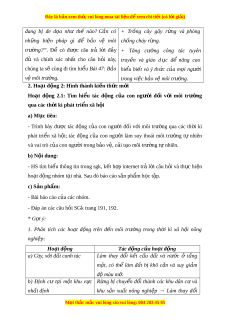 ờ gây nên tình tr ng a ô nhi m ê đầu tiên liên h p ợ qu c ố tổ ch c ứ h i ộ nghị môi trư ng ờ ở m c ứ báo đ ng ộ cao; về Môi trư ng ờ con ngư i ờ ph n ả ánh tính các khu r ng ừ đang d n ầ bị phá h y ủ cấp bách đ i ố v i ớ m t ộ số v n ấ đề môi gây nên sự bi n ế đ i ổ khí h u ậ trên trư ng ờ trên toàn c u. ầ Môi trư ng ờ s ng ố toàn c u ầ và s ự suy gi m ả đa d ng a c a ủ con ngư i ờ đang bị đe d a ọ như thế sinh h c; ọ … nào? Cần có nh ng ữ bi n ệ pháp gì đ ể b o ả vệ môi trư ng?”. ờ - Nh ng ữ bi n ệ pháp b o ả vệ môi trư ng: ờ - HS ti p nh ế n ậ nhi m ệ v . ụ + H n a ch ế ô nhi m ê môi trư ng: ờ xử Bư c ớ 2: Th c hi ự n nhi ệ m ệ v : ụ lí rác th i ả sinh ho t a và từ nhà máy - HS suy nghĩ trả l i ờ câu h i ỏ m đ ở u. ấ trư c ớ khi th i ả ra môi trư ng; ờ h n a Bư c
