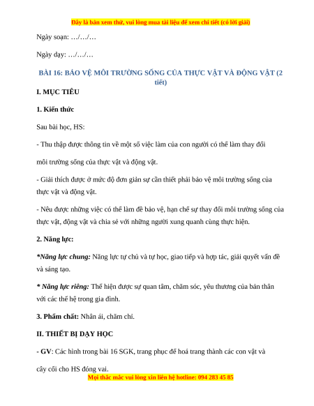BÀI 16: BẢO VỆ MÔI TRƯỜNG SỐNG CỦA THỰC VẬT VÀ ĐỘNG VẬT (2 tiết) I. MỤC TIÊU 1. Kiến thức Sau bài học, HS: