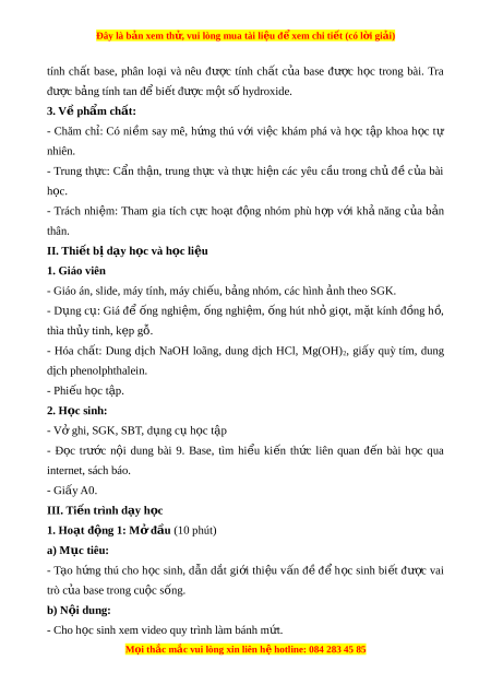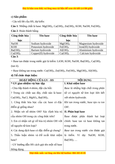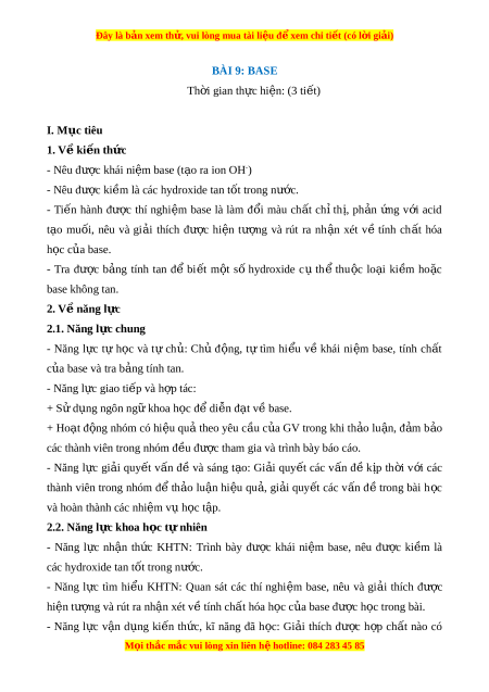 Đây là bản xem th , vu ử i lòng mua tài li u ệ đ xe ể m chi ti t ế (có l i ờ gi i ả ) BÀI 9: BASE Th i ờ gian th c hi ự n: ệ (3 ti t ế ) I. M c t ụ iêu 1. V ki ề n t ế h c ứ - Nêu đư c ơ khai ni m ệ base (t o r a a ion OH-) - Nêu đư c ơ ki m ê la cac hydroxide tan t t ô trong nư c. ơ - Ti n ế hanh đư c ơ thi nghi m ệ base la lam đ i ô mau ch t â ch ith ,i ph n a ng ư v i ơ acid t o a mu i ô , nêu va gi i a thich đư c ơ hi n ệ tư ng ơ va rut ra nh n â xet v ê tinh ch t â hoa h c o c a bas u e. - Tra đư c ơ b ng a tinh tan đ ê bi t ế m t ô s ô hydroxide c u th ê thu c ô lo i a ki m ê ho c ă base không tan. 2. V năng l ề c ự