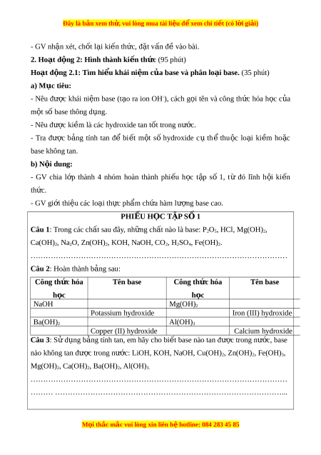 Đây là bản xem th , vu ử i lòng mua tài li u ệ đ xe ể m chi ti t ế (có l i ờ gi i ả ) - GV nh n xet â , chôt l i a ki n t ế h c, ư đ t ă v n đ â vao bai ê . 2. Hoạt đ ng 2 ộ : Hình thành ki n t ế h c ứ (95 phut) Hoạt đ ng 2.1 ộ : Tìm hi u khái ể ni m ệ c a bas u e và phân lo i ạ base. (35 phut) a) M c t ụ iêu: - Nêu đư c ơ khai ni m ệ base (t o a ra ion OH-), cach g i o tên va công th c ư hoa h c o c a u m t ô sô base thông d ng. u - Nêu đư c ơ ki m ê la cac hydroxide tan t t ô trong nư c. ơ - Tra đư c ơ b ng a tinh tan đ ê bi t ế m t ô s ô hydroxide c u th ê thu c ô lo i a ki m ê ho c ă base không tan. b) N i ộ dung: - GV chia l p
