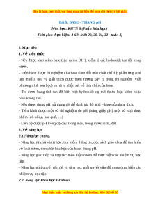 ế 29, 30, 31, 32 - tu n 8) ầ I. M c t ụ iêu 1. V ki ề n t ế h c ứ - Nêu đư c ợ khái ni m ệ base (t o ạ ra ion OH-), ki m ề là các hydroxide tan t t ố trong nư c. ớ - Ti n ế hành đư c ợ thí nghi m ệ c a ủ base (làm đ i ổ màu ch t ấ ch ỉth ;ị ph n ả ng ứ acid t o ạ mu i ố ); nêu và gi i ả thích đư c ợ hi n ệ tư ng ợ x y ả ra trong thí nghi m ệ (vi t ế phư ng ơ trình hóa h c) ọ và rút ra nh n xét ậ v t ề ính ch t ấ c a ủ base. - Tra đư c ợ b ng ả tính tan để bi t ế m t ộ hydroxide cụ thể thu c ộ lo i ạ ki m ề ho c ặ base không tan. - Nêu đư c ợ thang pH, sử d ng pH ụ đ đánh gi ể á đ aci ộ d – base c a dung d ủ ch. ị - Ti n ế hành đư c ợ m t ộ số thí nghi m ệ đo pH (b ng ằ gi y ấ pH) m t ộ số lo i ạ th c ự phẩm (đồ uống, hoa qu , ả …) - Liên h đ ệ ư c ợ pH trong d dày ạ , trong máu, trong nư c ớ m a, đ ư t ấ . 2. V năng l ề c ự