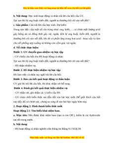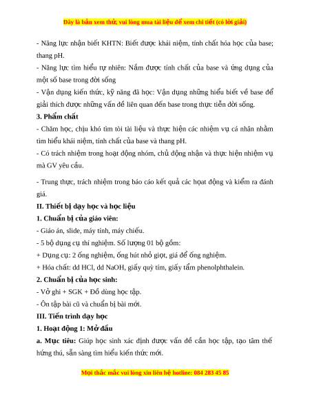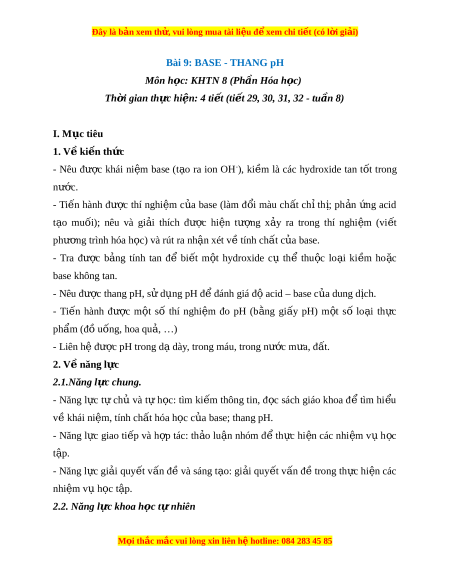 Đây là bản xem th , vu ử i lòng mua tài li u ệ đ xe ể m chi ti t (c ế ó l i ờ gi i ả ) - Năng l c ự nh n ậ bi t ế KHTN: Bi t ế đư c ợ khái ni m ệ , tính ch t ấ hóa h c ọ c a ủ base; thang pH. - Năng l c ự tìm hi u ể tự nhiên: N m ắ đư c ợ tính ch t ấ c a ủ base và ng ứ d ng ụ c a ủ m t ộ số base trong đ i ờ sống - V n ậ d ng ụ ki n ế th c, ứ kỹ năng đã h c: ọ V n ậ d ng ụ nh ng ữ hi u ể bi t ế về base để gi i ả thích đư c nh ợ ng v ữ n đ ấ l ề iên quan đ n ế base trong th c t ự i n đ ễ i ờ s ng. ố 3. Phẩm ch t ấ - Chăm h c, ọ ch u ị khó tìm tòi tài li u ệ và th c ự hi n ệ các nhi m ệ vụ cá nhân nh m ằ tìm hi u khái ể ni m ệ , tính ch t ấ c a bas ủ e và thang pH. - Có trách nhi m ệ trong ho t ạ đ ng ộ nhóm, ch ủ đ ng ộ nh n ậ và th c ự hi n ệ nhi m ệ vụ mà GV yêu cầu. - Trung th c, ự trách nhi m ệ trong báo cáo k t ế quả các h at ọ đ ng ộ và ki m ể ra đánh giá. II. Thi t ế b d ị y h ạ c ọ và h c l ọ i u ệ 1. Chuẩn b c ị a g ủ iáo viên: