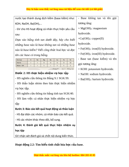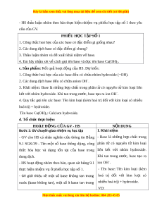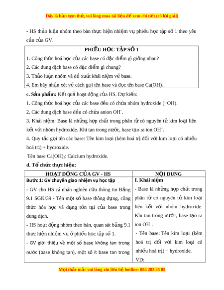 Đây là bản xem th , vu ử i lòng mua tài li u ệ đ xe ể m chi ti t (c ế ó l i ờ gi i ả ) - HS th o ả lu n ậ nhóm theo bàn th c ự hi n ệ nhi m ệ v ụ phi u ế h c ọ t p ậ s ố 1 theo yêu cầu c a ủ GV. PHI U Ế H C Ọ TẬP S 1 Ố 1. Công th c hoá h ứ c ọ c a các ủ base có đ c đi ặ m ể gì gi ng nhau? ố 2. Các dung d ch bas ị e có đ c ặ đi m ể gì chung? 3. Th o ả lu n nhóm ậ và đ xu ề t ấ khái ni m ệ v bas ề e. 4. Em hãy nh n xét ậ về cách g i ọ tên base và đ c ọ tên base Ca(OH)2. c. Sản phẩm: K t ế quả ho t ạ đ ng ộ c a H ủ S. D ki ự n: ế 1. Công th c hoá h ứ c ọ c a các ủ base đ u ề có ch a nhóm ứ hydroxide (−OH). 2. Các dung d ch bas ị e đ u có ch ề a ứ anion OH−. 3. Khái ni m ệ : Base là nh ng ữ h p ợ ch t