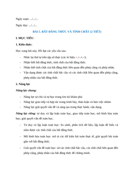 BÀI 5. BẤT ĐẲNG THỨC VÀ TÍNH CHẤT (2 TIẾT) I. MỤC TIÊU: