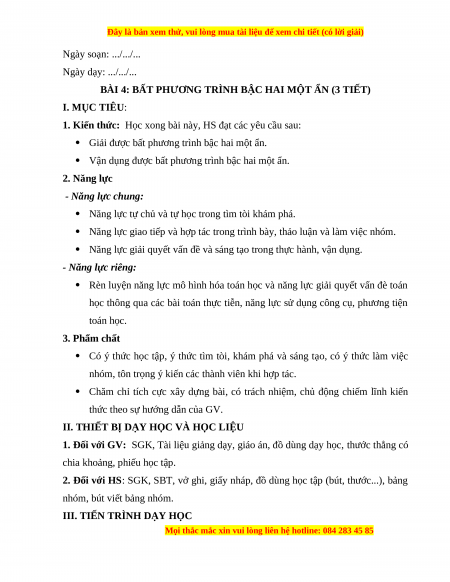 BÀI 4: BẤT PHƯƠNG TRÌNH BẬC HAI MỘT ẨN (3 TIẾT) I. MỤC TIÊU: