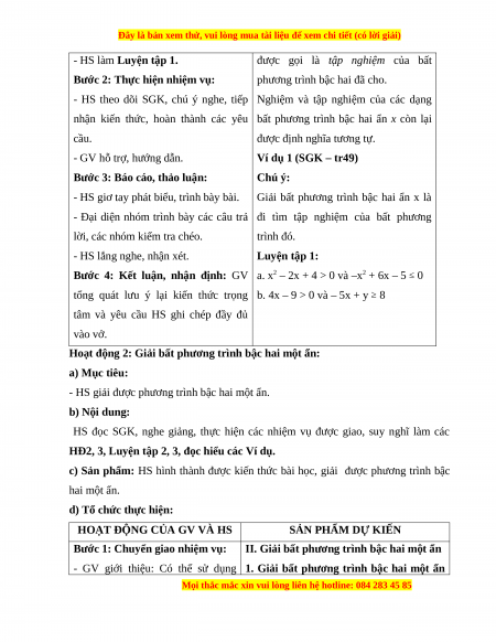 Hoạt động 2: Giải bất phương trình bậc hai một ẩn: a) Mục tiêu:
