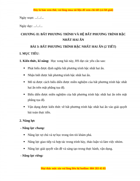 BÀI 3: BẤT PHƯƠNG TRÌNH BẬC NHẤT HAI ẨN (2 TIẾT) I. MỤC TIÊU: