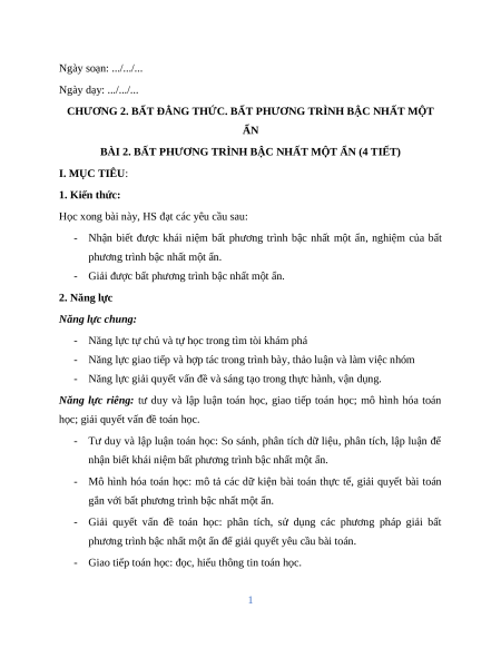 BÀI 2. BẤT PHƯƠNG TRÌNH BẬC NHẤT MỘT ẨN (4 TIẾT) I. MỤC TIÊU: