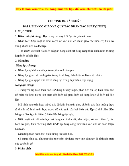 BÀI 1. BIẾN CỐ GIAO VÀ QUY TẮC NHÂN XÁC SUẤT (2 TIẾT) I. MỤC TIÊU: