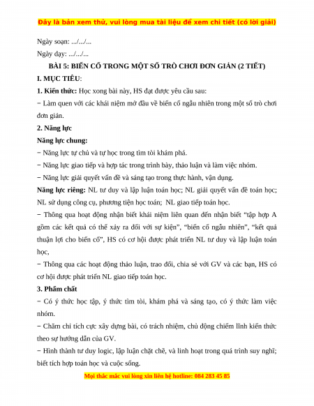 BÀI 5: BIẾN CỐ TRONG MỘT SỐ TRÒ CHƠI ĐƠN GIẢN (2 TIẾT) I. MỤC TIÊU: