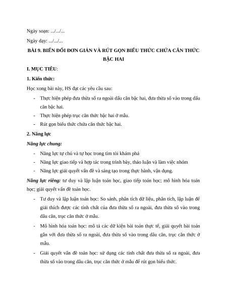 BÀI 9. BIẾN ĐỔI ĐƠN GIẢN VÀ RÚT GỌN BIỂU THỨC CHỨA CĂN THỨC BẬC HAI I. MỤC TIÊU:
