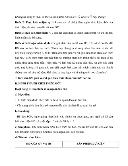 - Vận dụng phép đưa thừa số ra ngoài dấu căn bậc hai để so sánh hai số. b) Nội dung: