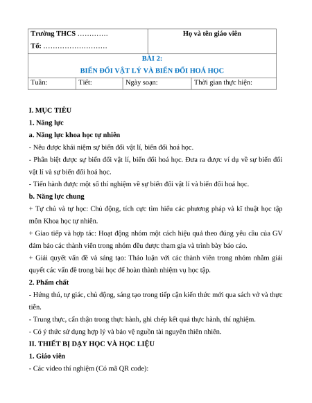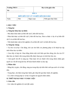 BIẾN ĐỔI VẬT LÝ VÀ BIẾN ĐỔI HOÁ HỌC Tuần: Tiết: Ngày soạn: Thời gian thực hiện: I. MỤC TIÊU 1. Năng lực