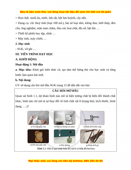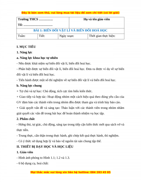 BÀI 1: BIẾN ĐỔI VẬT LÍ VÀ BIẾN ĐỔI HOÁ HỌC Tuần: Tiết: Ngày soạn: Thời gian thực hiện: I. MỤC TIÊU 1. Năng lực