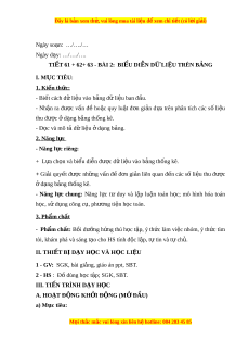 TIẾT 61 + 62+ 63 - BÀI 2: BI U Ể DI N Ễ D L Ữ I U Ệ TRÊN B N Ả G I. M C Ụ TIÊU: 1. Ki n t ế h c ứ : - Bi t ế cách d l ữ i u vào b ệ ng ả d l ữ i u ban đ ệ u. ầ - Nh n ậ ra đư c ợ v n ấ đ ề ho c ặ quy lu t ậ đ n ơ gi n ả d a ự trên phân tích các s ố li u ệ thu đư c ợ ở d ng b ạ ng ả thống kê. - Đ c ọ và mô t d ả ữ li u ệ d ở ng ạ b ng. ả 2. Năng l c ự - Năng l c ri ự êng: + L a ự ch n và bi ọ u di ể n đ ễ ư c ợ d l ữ i u vào b ệ ng t ả h ng kê. ố + Gi i ả quy t ế đư c ợ nh ng v ữ n đ ấ đ ề n gi ơ n ả liên quan đ n các s ế ố li u t ệ hu đư c ợ d ở ng ạ b ng t ả hống kê. - Năng l c ự chung: Năng l c ự tư duy và l p ậ lu n ậ toán h c; ọ mô hình hóa toán h c, s ọ ử d ng công c ụ , ụ phư ng t ơ i n h ệ c t ọ oán. 3. Ph m ẩ chất - Phẩm ch t ấ : Bồi dư ng h ỡ ng t ứ hú h c ọ t p, ý t ậ h c l ứ àm vi c nhóm ệ , ý th c t ứ ìm