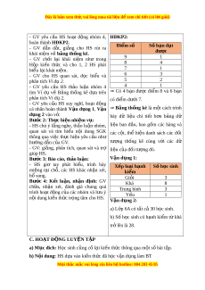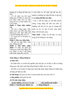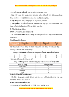 ớ 3: Báo cáo, th o l ả u n: ậ - HS giơ tay phát bi u, ể trình bày mi ng t ệ i ạ chỗ. T K L N N V Bư c ớ 4: K t ế lu n, ậ nh n ậ N V T C T L đ n ị h: GV nh n ậ xét, đánh giá chung quá trình ho t ạ đ ng ộ c a ủ các nhóm và l u ư ý n i ộ dung ki n t ế h c t ứ r ng t ọ âm cho HS. Hoạt đ ng 2: ộ B ng t ả h ng kê ố a) M c t ụ iêu: - HS nh n ậ bi t ế , có c h ơ i ộ tr i ả nghi m ệ s p ắ x p ế l i ạ các s l ố i u có ệ s n ẵ vào b ng ả thông qua vi c t ệ h c hành l ự p ậ b ng t ả h ng kê đi ố m ể c a các ủ b n. ạ - HS bi t ế và rèn luy n ệ kĩ năng th c ự hành l p ậ đư c ợ b ng ả th ng ố kê tư ng ơ ng ứ t b ừ ng s ả ố li u ban đ ệ u. ầ b) N i
