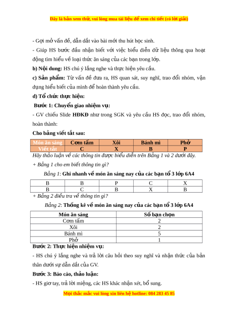 Đây là bản xem th , vu ử i lòng mua tài li u ệ đ xe ể m chi ti t ế (có l i ờ gi i ả ) - G i ợ m v ở ấn đ , d ề ẫn d t ắ vào bài m i ớ thu hút h c s ọ inh. - Giúp HS bư c ớ đ u ầ nh n ậ bi t ế v i ớ vi c ệ bi u ể di n ễ dữ li u ệ thông qua ho t ạ đ ng t ộ ìm hi u v ể l ề o i ạ th c ứ ăn sáng c a ủ các b n ạ trong l p. ớ b) N i