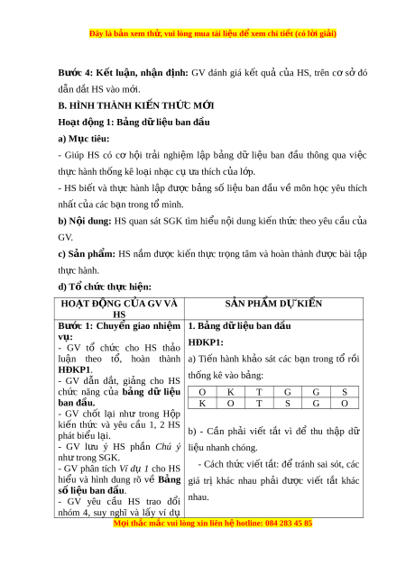 d) Tổ chức thực hi n: ệ HOẠT Đ N Ộ G C A Ủ GV VÀ SẢN PHẨM D K Ự I N Ế HS Bư c ớ 1: Chuy n ể giao nhi m ệ 1. Bảng d l ữ i u ban đ ệ u ầ v : ụ HĐKP1: - GV tổ ch c ứ cho HS th o ả lu n ậ theo t , ổ hoàn thành a) Ti n ế hành kh o ả sát các b n ạ trong tổ r i ồ HĐKP1. thống kê vào b ng: ả - GV d n ẫ d t ắ , gi ng ả cho HS ch c ứ năng c a ủ bảng dữ li u ệ O K T G G S ban đ u. ầ K O T S G O - GV ch t ố l i ạ như trong H p ộ ki n ế th c ứ và yêu c u ầ 1, 2 HS phát bi u l ể i ạ . b) - C n ầ ph i ả vi t ế t t ắ vì để thu th p ậ dữ - GV l u ư ý HS ph n ầ Chú ý li u nhanh ệ chóng. nh t ư rong SGK.