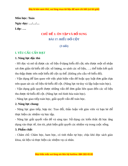 I. YÊU CẦU CẦN ĐẠT 1. Năng l c đ ự c t ặ hù - HS đ c ọ và mô tả đư c ợ các s ố li u ệ ở d ng ạ bi u ể đ ồ c t ộ ; nêu đư c ợ m t ộ s ố nh n ậ xét đ n ơ gi n ả từ bi u ể đ ồ c t ộ : số lư ng, ợ so sánh các s ố li u, ệ …; th ể hi n ệ k t ế quả thu th p ậ đư c t ợ rên m t ộ bi u đ ể c ồ t ộ c t ụ h . ( ể không yêu c u v ầ bi ẽ u đ ể ) ồ . - V n ậ d ng ụ để làm quen v i ớ vi c ệ phát hi n ệ v n ấ đ ề ho c ặ quy lu t ậ đ n ơ gi n ả d a ự
