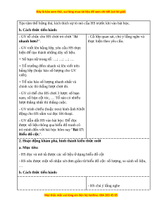 hú, kích thích sự tò mò c a H ủ S trư c khi ớ vào bài h c. ọ b. Cách th c t ứ i n hành: ế - GV tổ ch c cho H ứ S ch i ơ trò ch i ơ "Ai - Cả l p quan s ớ át, chú ý l ng nghe và ắ nhanh h n? ơ ". th c ự hi n t ệ heo yêu c u. ầ - GV vi t ế lên b ng ả l p, yêu c ớ u H ầ S th c ự hiện đ t ể o t ạ hành nh ng dãy ữ s l ố i u. ệ + Số b n ạ n t ữ rong t : ổ …; …; …; … + T t ổ rư ng đ ở m ế nhanh và lên vi t ế trên b ng l ả p ( ớ ho c ặ báo số lư ng cho ợ GV vi t ế ). + T nào ổ báo s l ố ư ng nhanh nh ợ t ấ và chính xác thì th ng l ắ ư t ợ ch i ơ đó. - GV có th cho H ể S ch i ơ 3 lư t ợ : s b ố n ạ nam, số b n ạ c t