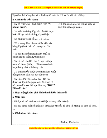 ộ tóc, … Tổ nào có nhi u ề lư t ợ th ng nh ắ t ấ thì th ng cu ắ c. ộ - GV trình chi u ế (ho c ặ treo) hình nh ả Kh i ở đ ng cho H ộ S s m ắ vai đ c ọ l i ờ tho i ạ . - GV dẫn d t ắ HS vào bài h c: ọ Đ đ ể c ọ đư c s ợ ố li u t ệ hông qua bi u đ ể ồ tranh cô trò mình đ n v ế i ớ bài h c hôm ọ nay "Bài 17: Bi u đ ể c ồ t ộ .". 2. Hoạt đ ng khá ộ