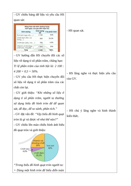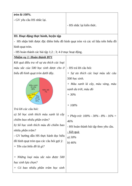 - HS nhận biết được biểu đồ hình quạt tròn và các dữ liệu trên biểu đồ hình quạt tròn * Cách tiến hành:
