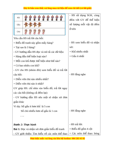 Đây là bản xem th , vu ử i lòng mua tài li u ệ đ xe ể m chi ti t (c ế ó l i ờ gi i ả ) - HS sử d ng ụ SGK, cùng đ m ế v i ớ GV để thể hi n ệ số lư ng ợ m i ỗ v t ậ đã đ m ế t ở rên Yêu c u H ầ S tr l ả i ờ câu h i ỏ : + Bi u ể đ t ồ ranh này g m ồ m y hàng? ấ - HS xem bi u ể đồ và nh n ậ + T i ạ sao là 3 hàng? xét: - GV hư ng d ớ n H ẫ S đ c và m ọ ô t các d ả l ữ i u: ệ + Kh nh ỉ i u ề nh t ấ + Hàng đ u t ầ h hi ể n l ệ o i ạ nào? + Gấu ít nh t ấ + Mỗi con kh đ ỉ ư c ợ th hi ể n nh ệ t ư h nào? ế + Có bao nhiêu con kh ? ỉ
