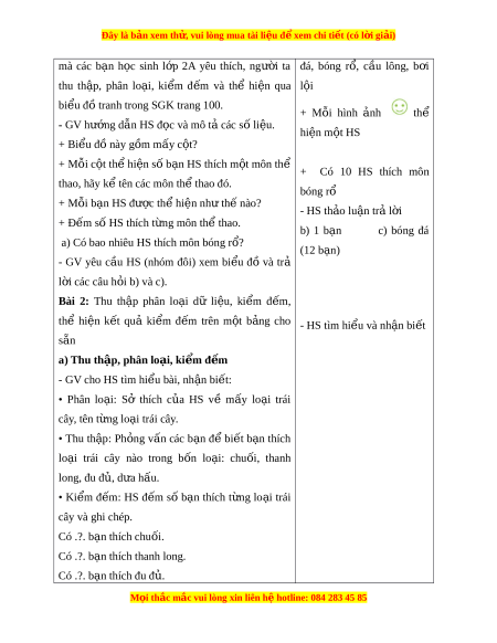 Đây là bản xem th , vu ử i lòng mua tài li u ệ đ xe ể m chi ti t (c ế ó l i ờ gi i ả ) - HS phân lo i ạ và trả l i ờ Phân lo i ạ - GV yêu c u ầ HS phân lo i ạ các di n ễ viên thú và tr l ả i ờ câu h i ỏ : + T i ạ sao em phân lo i ạ nh v ư y? ậ - HS đ m ế và ghi chép Ki m ể đ m ế - GV cho HS đ m ế số con v t ậ m i ỗ lo i