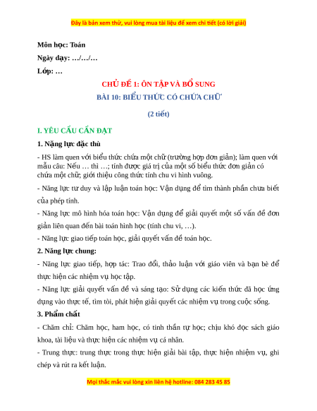 I. YÊU CẦU CẦN ĐẠT 1. Nặng l c đ ự ặc thù - HS làm quen v i ớ bi u t ể h c ch ứ a ứ m t ộ ch ( ữ trư ng ờ h p đ ợ n gi ơ n) ả ; làm quen v i ớ mẫu câu: N u … t ế hì …; tính đư c ợ giá tr c ị a m ủ t ộ s bi ố u t ể h c đ ứ n gi ơ n ả có ch a ứ m t ộ ch ; ữ gi i ớ thi u công t ệ h c t ứ ính chu vi hình vuông. - Năng l c ự tư duy và l p ậ lu n ậ toán h c: ọ V n ậ d ng ụ đ ể tìm thành ph n ầ ch a ư bi t ế c a ủ phép tính. - Năng l c ự mô hình hóa toán h c: ọ V n ậ d ng ụ để gi i ả quy t ế m t ộ số v n ấ đ ề đ n ơ gi n ả liên quan đ n bài ế toán hình h c ọ (tính chu vi, …). - Năng l c gi ự ao ti p t ế oán h c, gi ọ i ả quy t ế v n đ ấ t ề oán h c. ọ 2. Năng l c chung ự : - Năng l c ự giao ti p, ế h p ợ tác: Trao đ i ổ , th o ả lu n ậ v i ớ giáo viên và b n ạ bè để th c ự hi n các ệ nhi m ệ vụ h c t ọ p. ậ - Năng l c ự gi i ả quy t ế v n ấ đề và sáng t o: ạ Sử d ng ụ các ki n ế th c ứ đã h c ọ ng ứ d ng vào ụ th c t ự , t ế ìm tòi, phát hi n gi ệ i ả quy t ế các nhi m ệ v t ụ rong cu c s ộ ng. ố 3. Phẩm ch t ấ - Chăm ch : ỉ Chăm h c, ọ ham h c, ọ có tinh th n ầ tự h c; ọ ch u ị khó đ c ọ sách giáo khoa, tài li u và t ệ h c ự hi n các ệ nhi m ệ vụ cá nhân. - Trung th c: ự trung th c ự trong th c ự hi n ệ gi i ả bài t p, ậ th c ự hi n ệ nhi m ệ v , ụ ghi chép và rút ra k t ế lu n. ậ