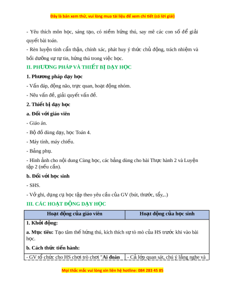 ậ chính xác, phát huy ý th c ứ chủ đ ng, ộ trách nhi m ệ và bồi dư ng s ỡ ự t t ự in, h ng t ứ hú trong vi c h ệ c. ọ II. PHƯ N Ơ G PHÁP VÀ THI T Ế B D Ị Y Ạ H C Ọ 1. Phư ng ơ pháp d y h ạ c ọ - Vấn đáp, đ ng ộ não, tr c ự quan, ho t ạ đ ng nhóm ộ . - Nêu vấn đ , gi ề i ả quy t ế v n đ ấ . ề 2. Thi t ế b d ị y h ạ c ọ a. Đ i ố v i ớ giáo viên - Giáo án. - Bộ đồ dùng d y ạ , h c ọ Toán 4. - Máy tính, máy chi u. ế - B ng ả ph . ụ - Hình nh cho ả n i ộ dung Cùng h c, ọ các b ng