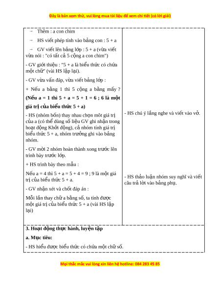 ế a = 6 thì ……… ? ……… ; ……… ? ……… M i ỗ lần thay ch b ữ ng s ằ , t ố a tính đư c ợ m t ộ giá tr c ị a bi ủ u t ể h c 5 + ứ a - GV hư ng d ớ ẫn HS tìm hi u bài ể và cách th c hi ự ện. + GV treo b ng ả ph ( ụ ho c ặ trình chi u) ế đ ể bài toán lên b ng ả l p. ớ + HS đ c đ ọ , nh ề n ậ bi t ế cái đã cho và cái ph i ả tìm, Gv g ch ạ dư i ớ các c m ụ t . ừ