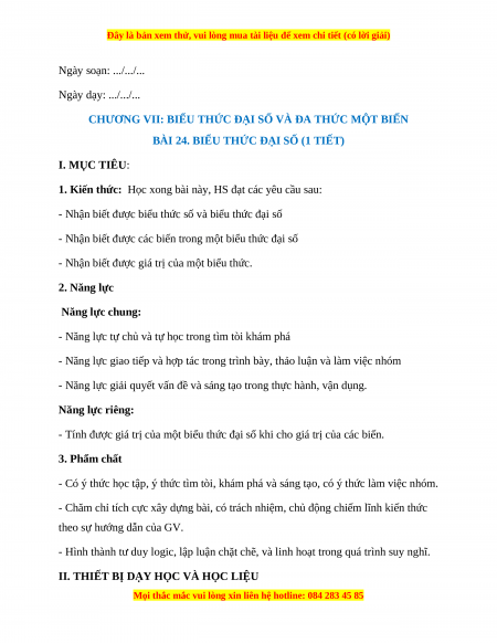 BÀI 24. BIỂU THỨC ĐẠI SỐ (1 TIẾT)