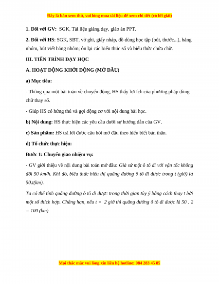 - Thông qua một bài toán về chuyển động, HS thấy lợi ích của phương pháp dùng chữ thay số.