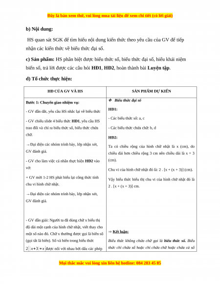 Hoạt động 1: Biểu thức đại số a) Mục tiêu: