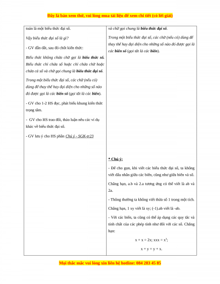 Giáo án Biểu thức đại số Toán 7 Kết nối tri thức