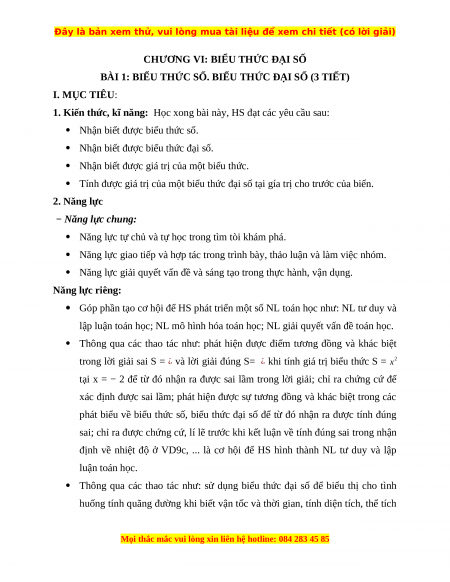 BÀI 1: BIỂU THỨC SỐ. BIỂU THỨC ĐẠI SỐ (3 TIẾT) I. MỤC TIÊU: