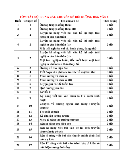 TÓM TẮT NỘI DUNG CÁC CHUYÊN ĐỀ BỒI DƯỠNG HSG VĂN 6 Buổi Chuyên đề Tên chuyên đề Thời lượng 1 1