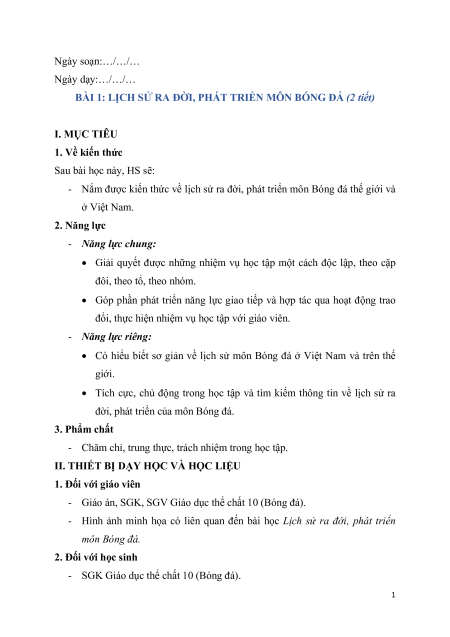 BÀI 1: LỊCH SỬ RA ĐỜI, PHÁT TRIỂN MÔN BÓNG ĐÁ (2 tiết) I. MỤC TIÊU 1. Về kiến thức